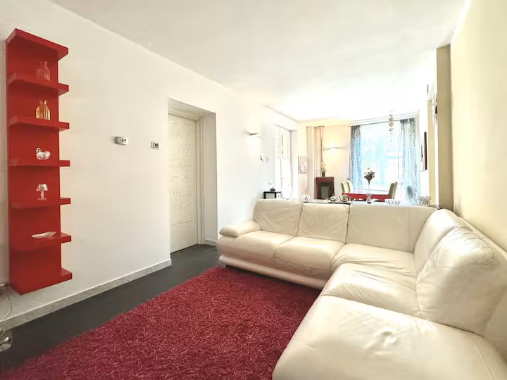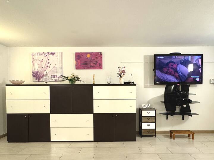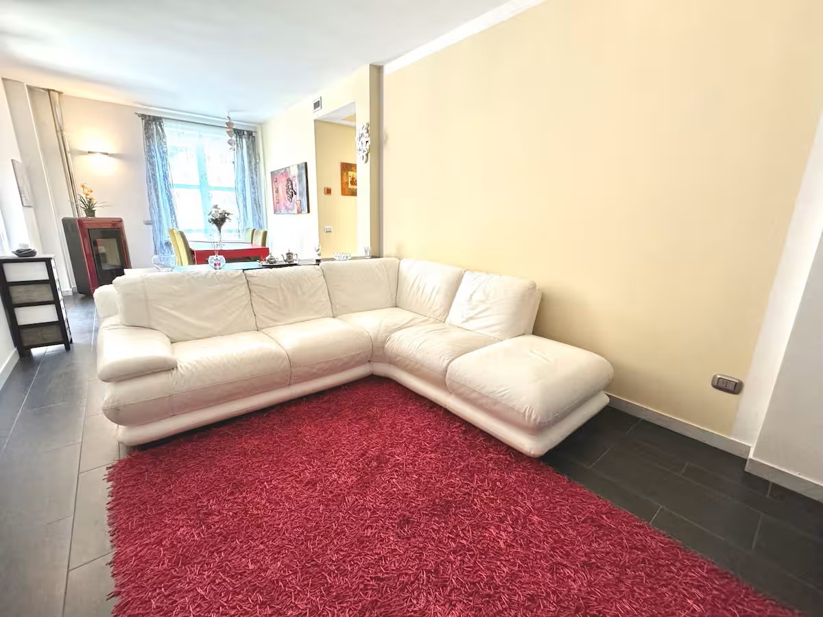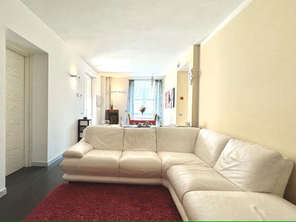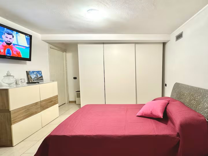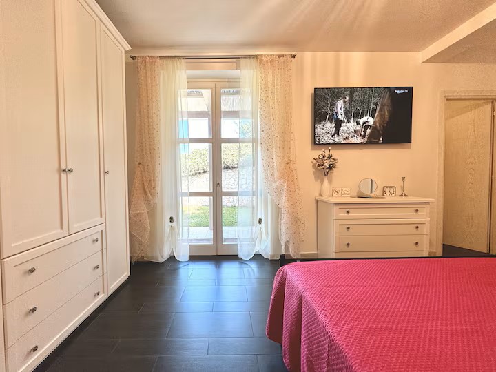 Al piano terra il grande living con tv, la camera matrimoniale ed il bagno con vasca.