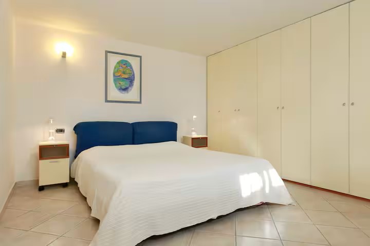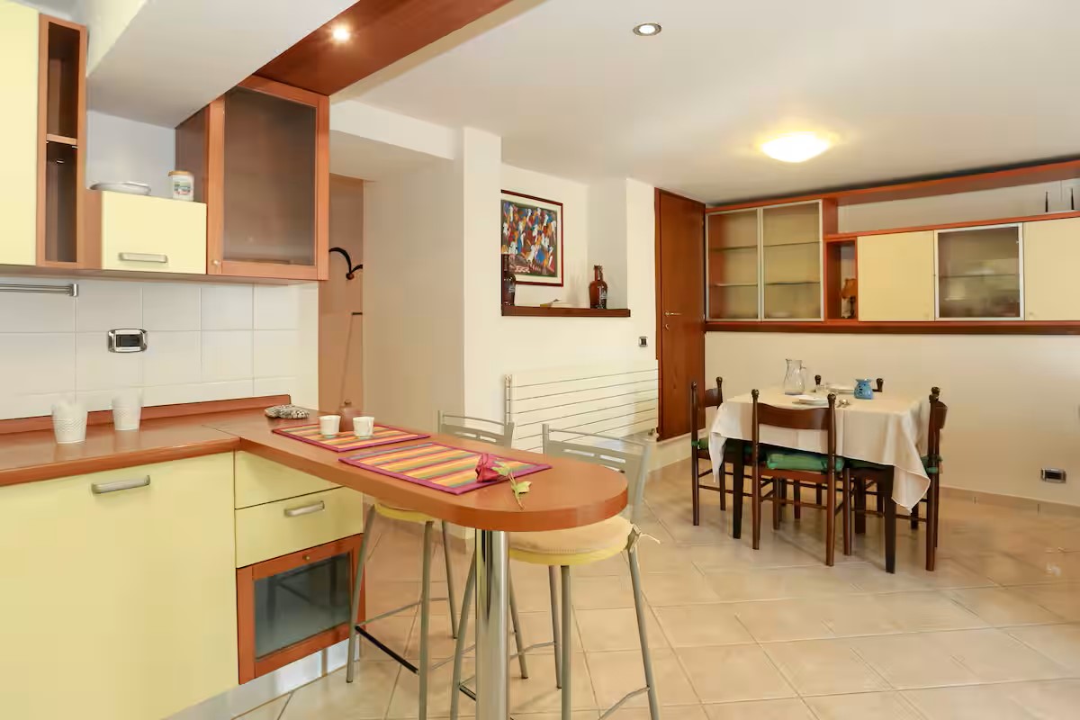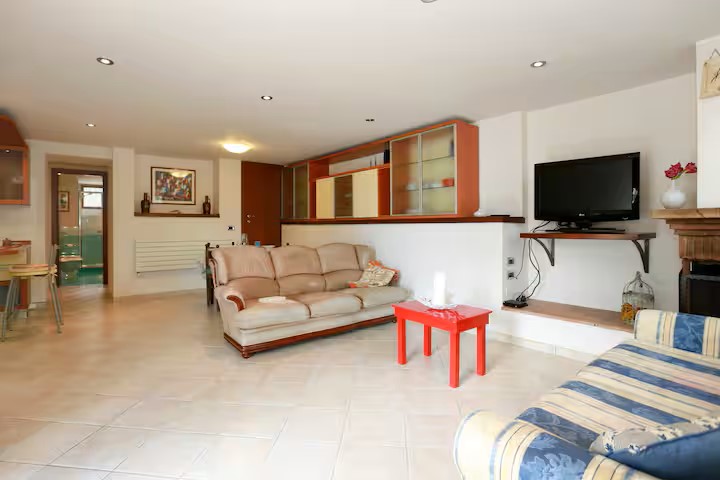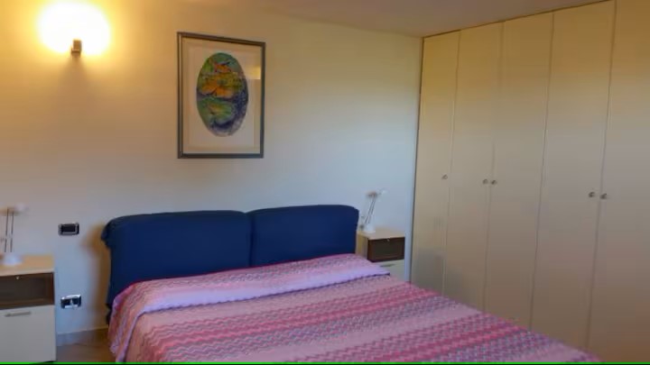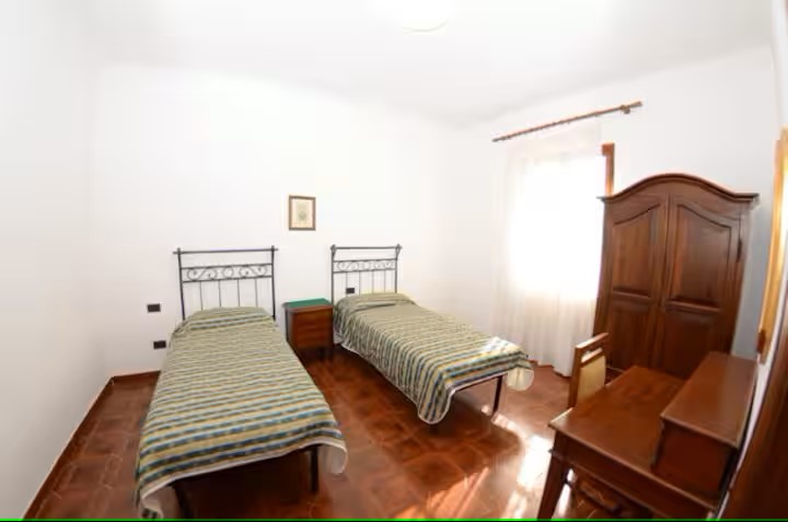 Appartamento al piano terra: ingresso in ampio soggiorno con salotto con divano letto e grande zona pranzo, cucina attrezzata e dotata di lavastoviglie, camera matrimoniale, due camere doppie ( ogni camera ha due letti singoli) e due bagni con doccia.