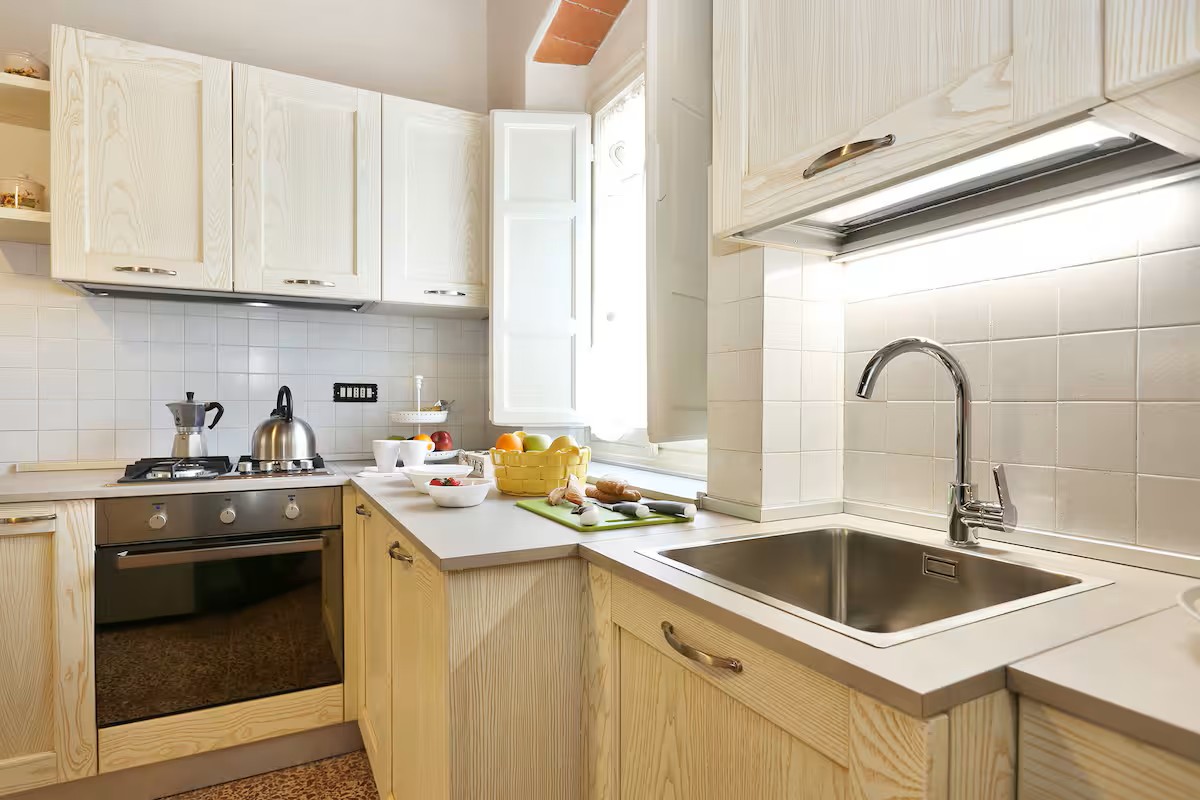 Al piano terra il soggiorno con il comodo divano letto, la cucina completamente attrezzata ed il bagno con doccia appena rinnovata .