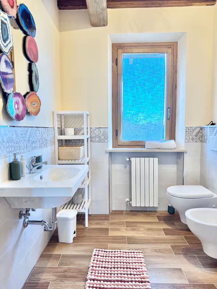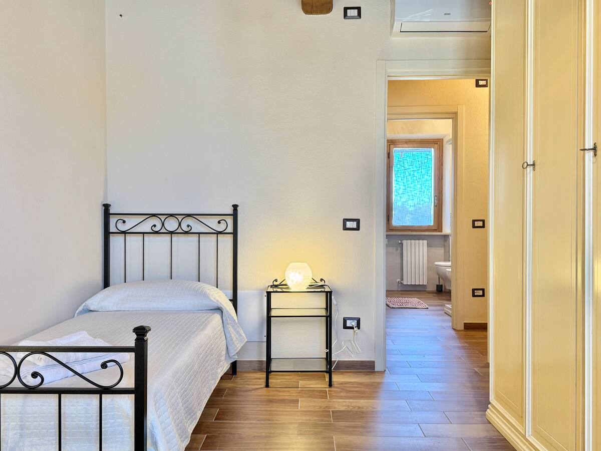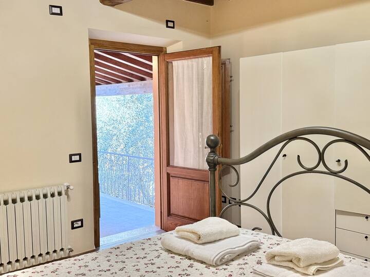 Salendo al primo piano troverete la camera matrimoniale con accesso a delizioso balcone arredato per aperitivi o relax, la camera con due letti singoli ed il bagno con doccia.