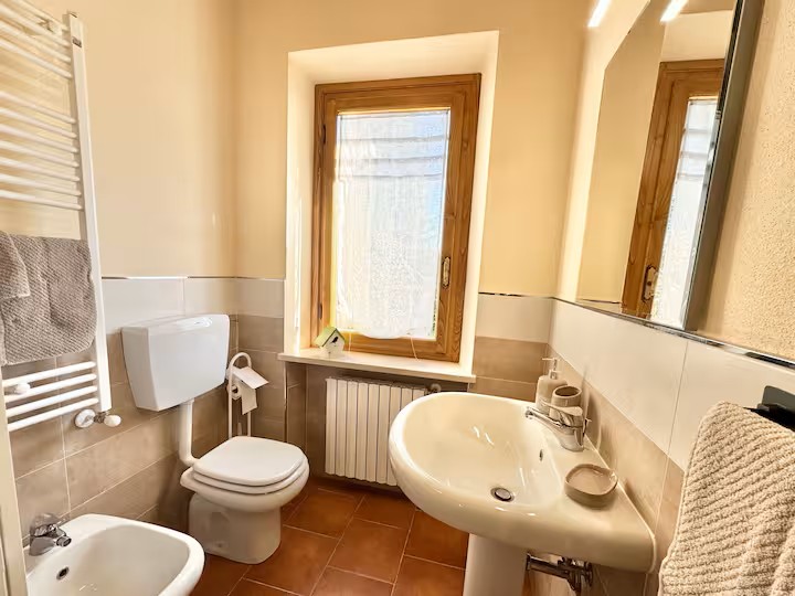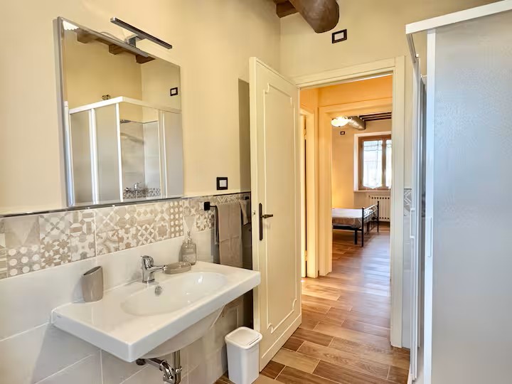Salendo al primo piano troverete la camera matrimoniale, la camera con due letti singoli ed il secondo bagno con doccia.