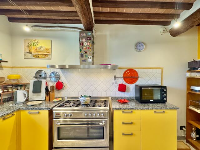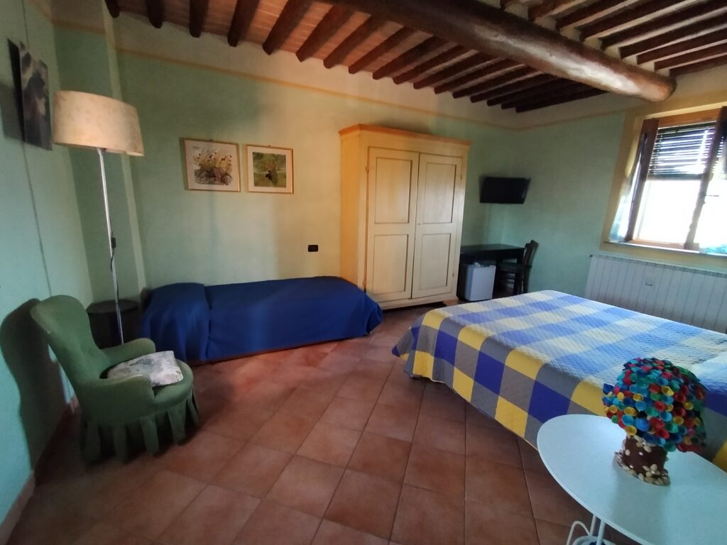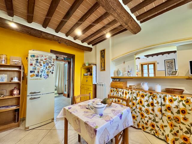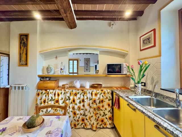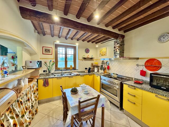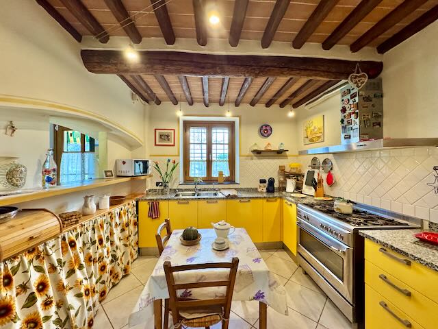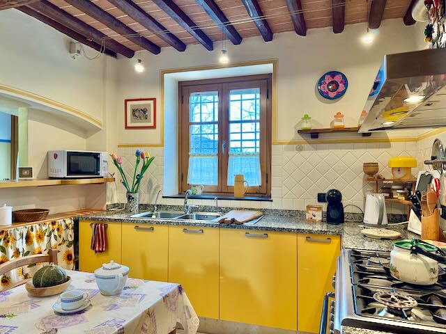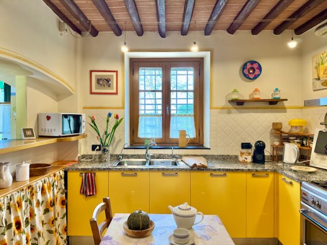 Al piano terra entrerete nel grande soggiorno arredato in tipico stile toscano da cui potete accedere al fantastico patio esterno arredato per cene o relax all'aperto, la cucina attrezzata per preparare cene e pranzi ed il bagno con lavatrice.